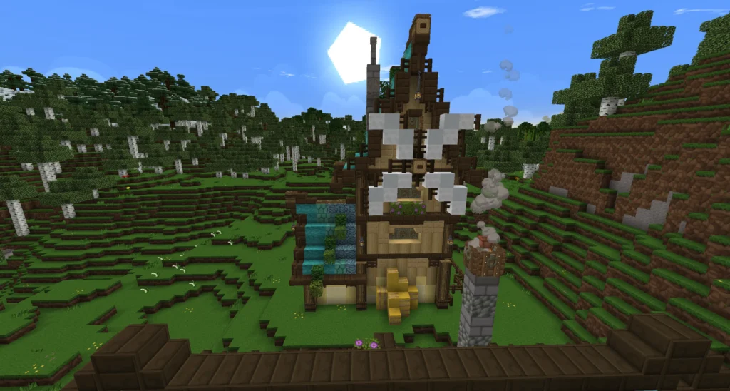 Von außen prägt das große Mühlrad das Bild und macht sofort klar, welche Aufgabe dieses Gebäude erfüllt. Das verwitterte Holz, das massive Fundament und das markante Dach verleihen der Mühle einen authentischen, mittelalterlichen Charakter. Kleine Details wie Rauch aus dem Schornstein, üppige Begrünung und die angrenzenden Wasserläufe runden das Gesamtbild stimmig ab.