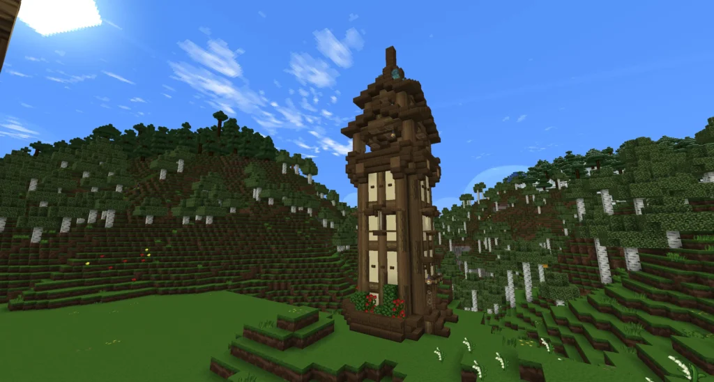 Der schlanke, hoch aufragende Bau fügt sich harmonisch in die umliegende Landschaft ein und markiert einen festen Punkt zwischen Hügeln, Wegen und den angrenzenden Gebäuden der Oststadt. Mit seiner massiven Holzkonstruktion, den hellen Wandflächen und dem markanten Dach wirkt der Turm zugleich stabil, elegant und eindeutig mittelalterlich.