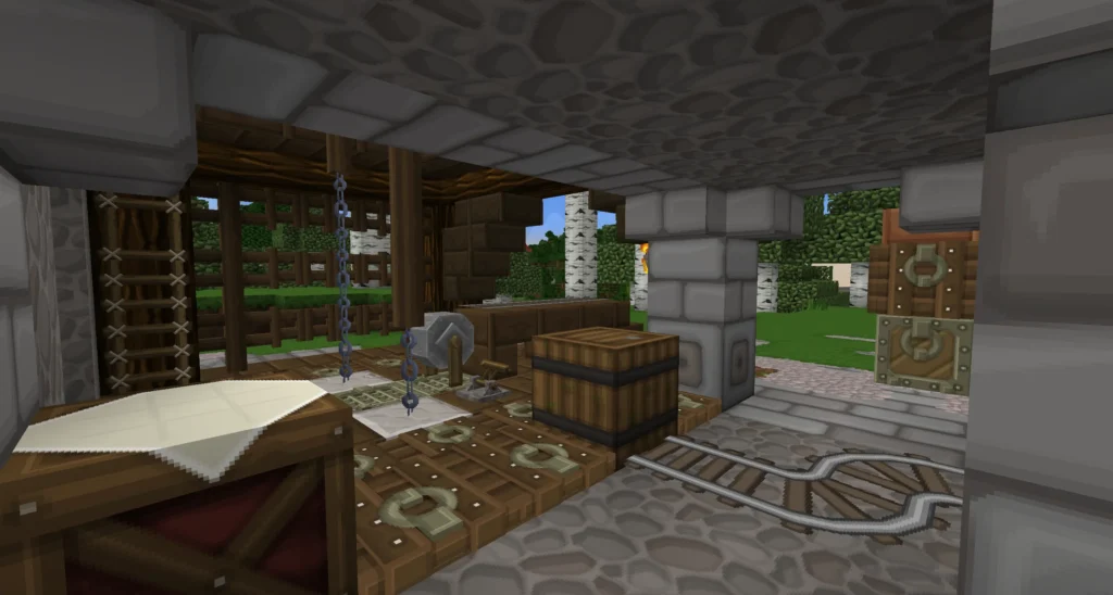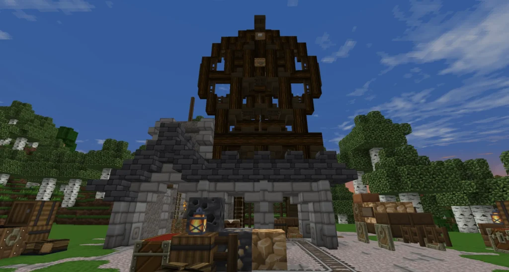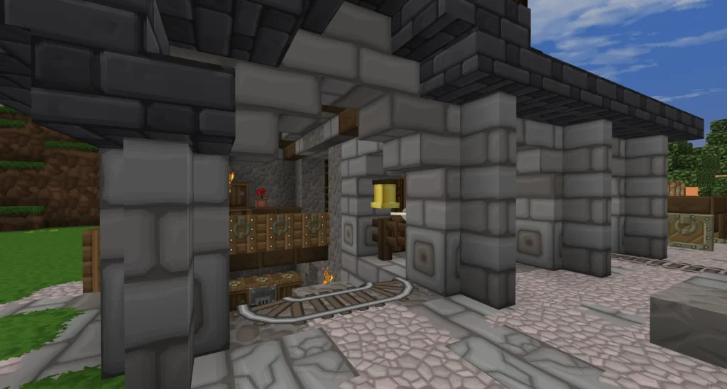 Das Gebäude ist klar auf Funktion ausgelegt. Massive Steinstrukturen, robuste Holzbalken und der deutlich sichtbare Schmelzbereich lassen keinen Zweifel an seinem Zweck. Hier endet der rohe Abbau – und beginnt die Weiterverarbeitung. Erze aus der Schwarzfels-Mine finden in der Schmelze ihren Weg zu brauchbaren Materialien, die für Bauprojekte, Werkstätten und zukünftige Erweiterungen benötigt werden.