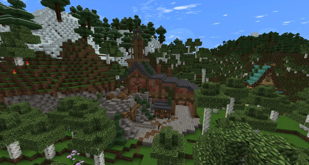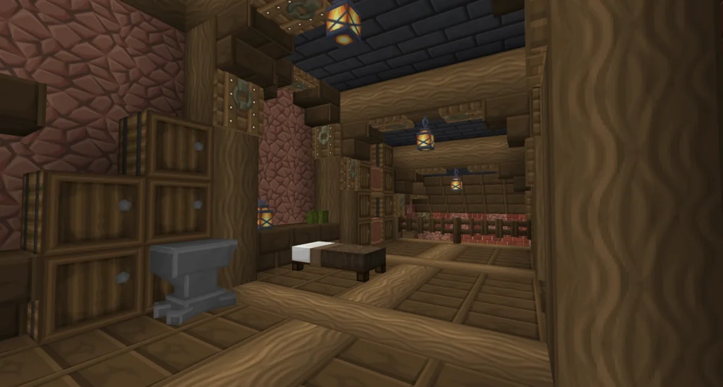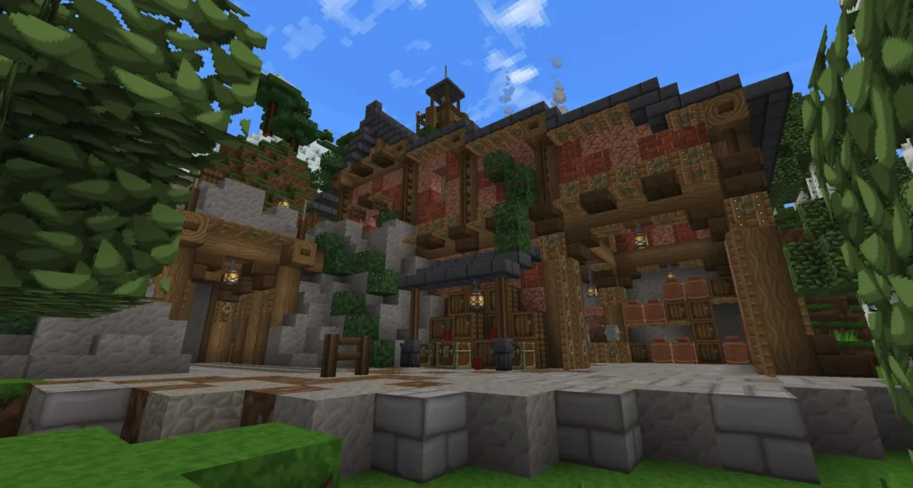 Schon jetzt ist der Mineneingang ein Ort geschäftiger Arbeit. Holzstützen, massive Steinstrukturen und funktionale Lagerflächen prägen das Bild und lassen erahnen, welche Bedeutung dieser Ort für die Versorgung der Stadt hat. Hier beginnt der Abbau von Ressourcen, die für Bauprojekte, Erweiterungen und das stetige Wachstum Crownfalls unerlässlich sind.