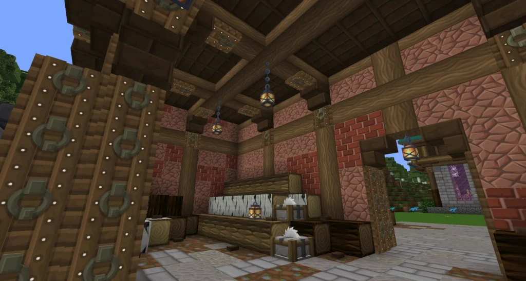 Architektonisch setzt das Gebäude auf die bewährte Kombination aus Ziegelstein und kräftigem Holzfachwerk, gekrönt von einem wuchtigen grauen Steildach. Die überdachte Außenarbeitsstation mit Sägegestell und bereitliegenden Birkenstämmen macht den Arbeitsprozess direkt sichtbar – hier wird nicht nur verwaltet, sondern angepackt. Im Inneren sorgen offene Arbeitsbalken, Holzlager und warm leuchtende Laternen für eine Atmosphäre, die zwischen Werkstatt und Lagerhaus liegt.
