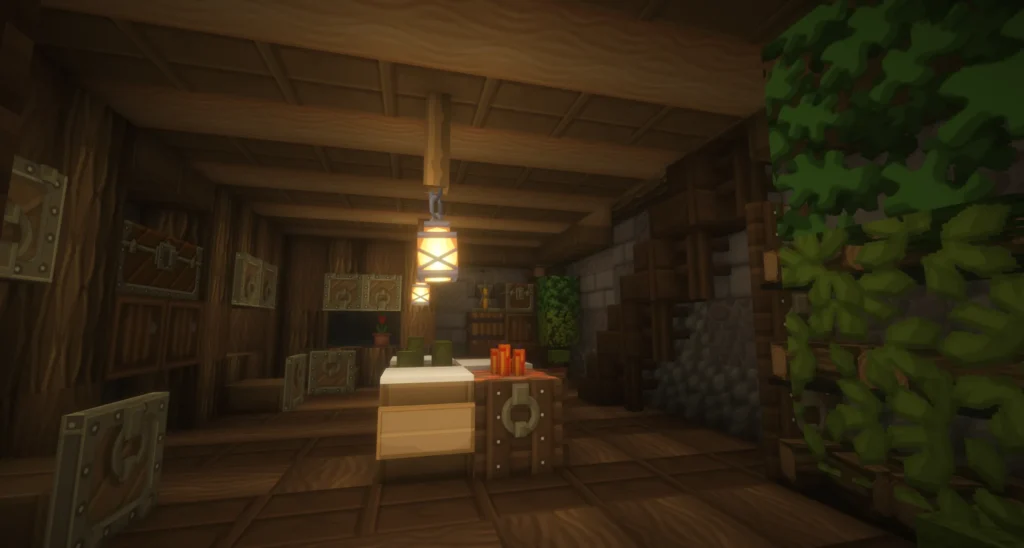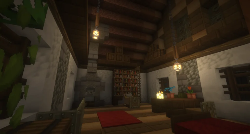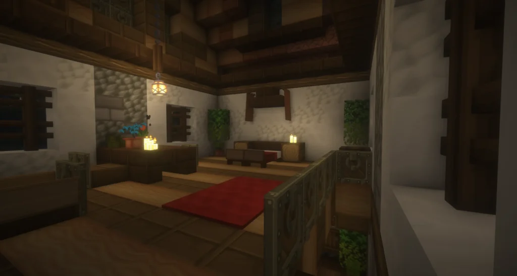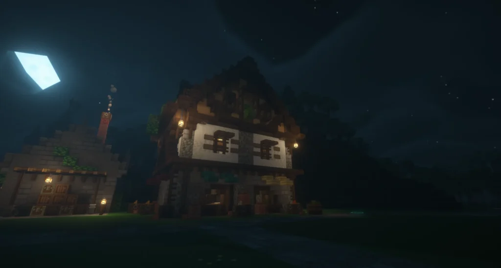 Architektonisch setzt das Markthaus auf ein klassisches Fachwerkbild: Weiße Putzflächen, dunkle Holzbalken und ein markantes Obergeschoss verleihen dem Gebäude ein einladendes, bürgerliches Gesicht. Im Erdgeschoss empfängt ein Tresen mit Truhen und Kerzenlichtern die Kundschaft, während das obere Stockwerk mit rotem Teppich, Bücherregal und Sitzmöbeln eine fast wohnliche Atmosphäre verbreitet – ein Laden, in dem man gerne verweilt. Nachts strahlt das Markthaus warm in die Dunkelheit und macht deutlich: Hier ist Leben.