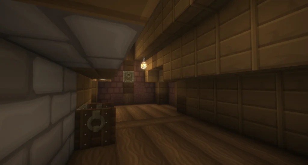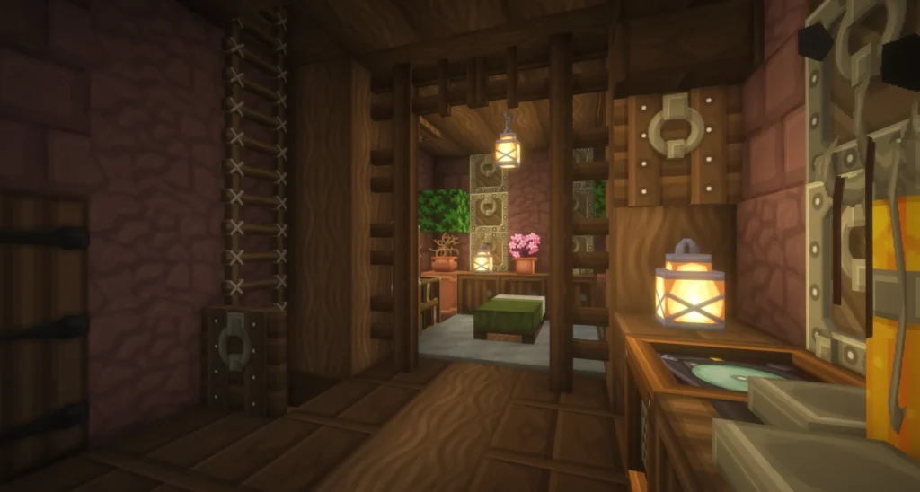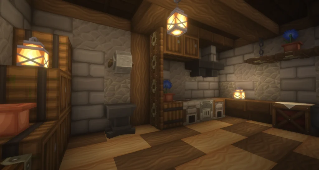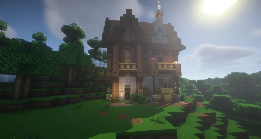 Architektonisch erzählt das Haus eine klare Geschichte in drei Ebenen: Ein solider Steinsockel im Erdgeschoss bildet das Fundament, darüber folgt ein Obergeschoss aus Lehmziegeln und Holz, das dem Gebäude eine warme, rustikale Note verleiht. Das Dach aus Fichten- und Eichenholz rundet den Bau mit einem natürlichen, erdigen Abschluss ab. Am Eingang empfangen einige Kisten und Heuballen die Bewohner – ein Detail, das das Haus sofort belebt und bewohnt wirken lässt. Im Inneren überzeugt das Haus mit einer gemütlichen Küche mit Kamin und Schachbrettboden, sowie einem wohnlichen Obergeschoss mit Bett und Blumendekoration.