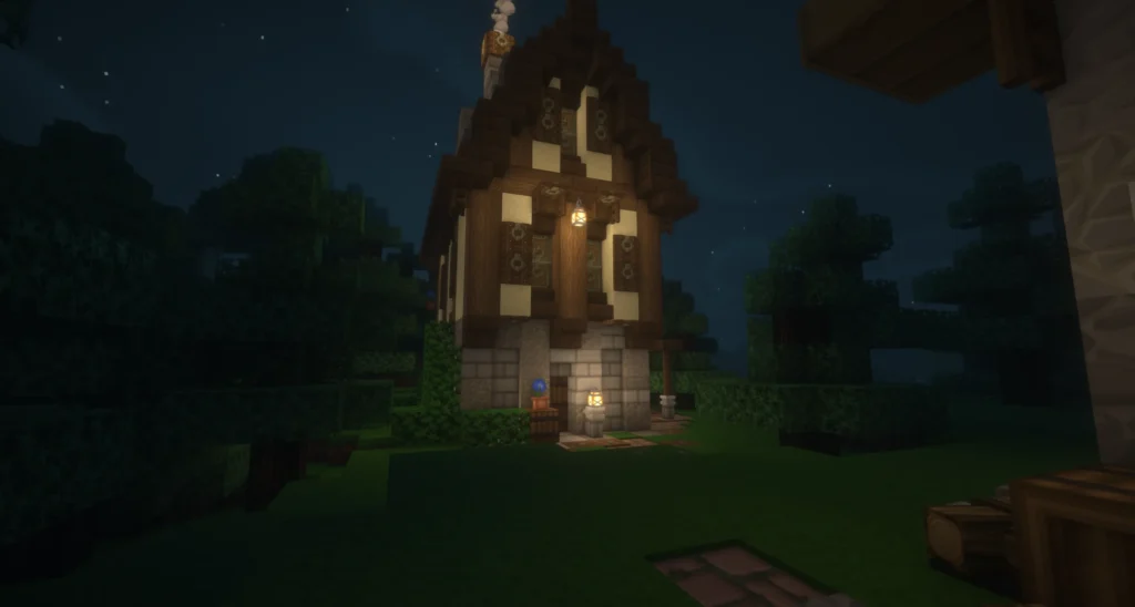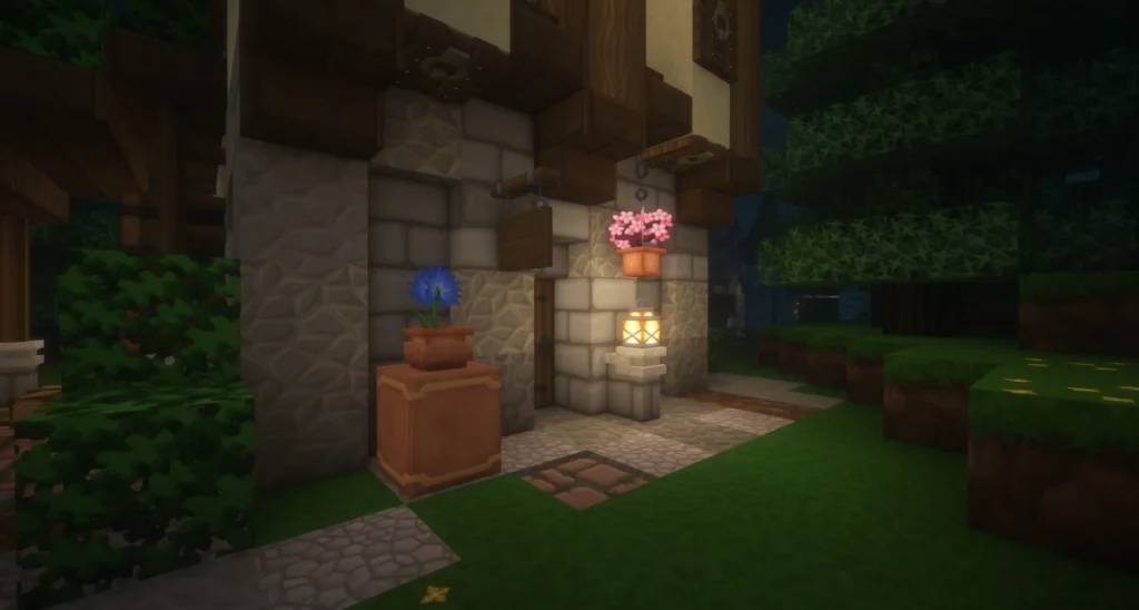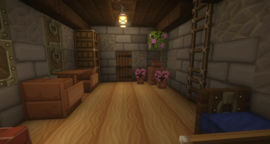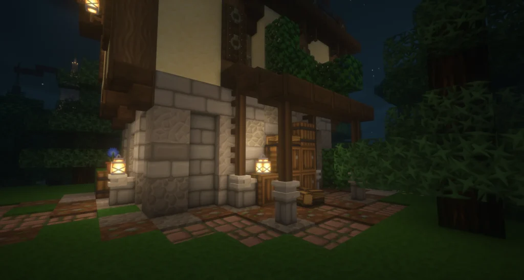 Architektonisch setzt das vierte Wohnhaus einen eigenen Akzent in der Reihe seiner Nachbarn. Das Erdgeschoss aus solidem Stein bildet eine ruhige, beständige Basis, während das Obergeschoss aus hellem Sand- und Sandstein dem Gebäude eine warme, fast mediterrane Note verleiht. Zwei Eingänge sorgen für eine großzügige Erschließung, und ein kleiner Unterstand mit Barrels bietet praktischen Stauraum direkt am Haus. Blumentöpfe mit blauen Kornblumen und rosa Kirschblüten sowie eine warm leuchtende Laterne am Eingang verleihen dem Gebäude eine einladende Wärme. Im Inneren empfängt die Bewohner ein heller, freundlicher Wohnraum mit Bücherregal, Blumendekoration und einer Leiter ins Obergeschoss.