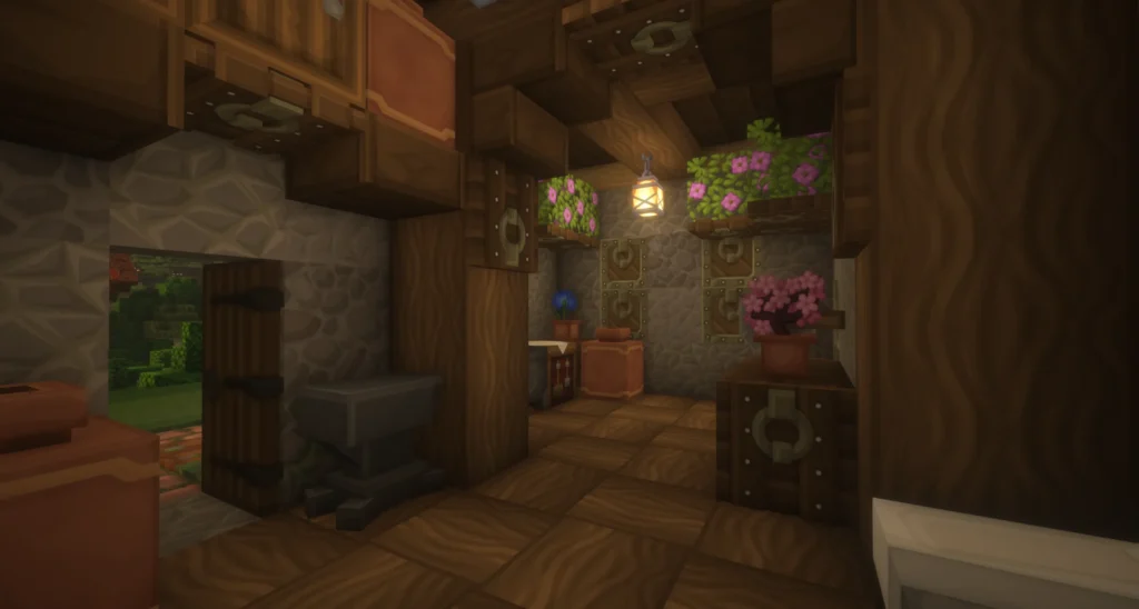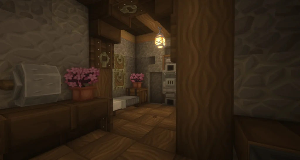Gebaut aus solidem Stein und mit einem warmen Holzdach abgeschlossen, setzt das dritte Wohnhaus auf eine schlichte, ehrliche Bauweise. Im Inneren erwartet die Bewohner ein gemütliches Erdgeschoss mit Blumentöpfen, Laternen und einem Amboss, sowie ein kleines Schlafzimmer, das mit rosa Kirschblüten und einem Ofen eine erstaunliche Wärme ausstrahlt.