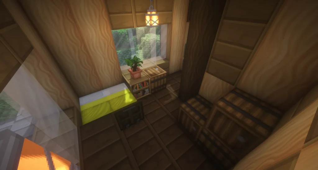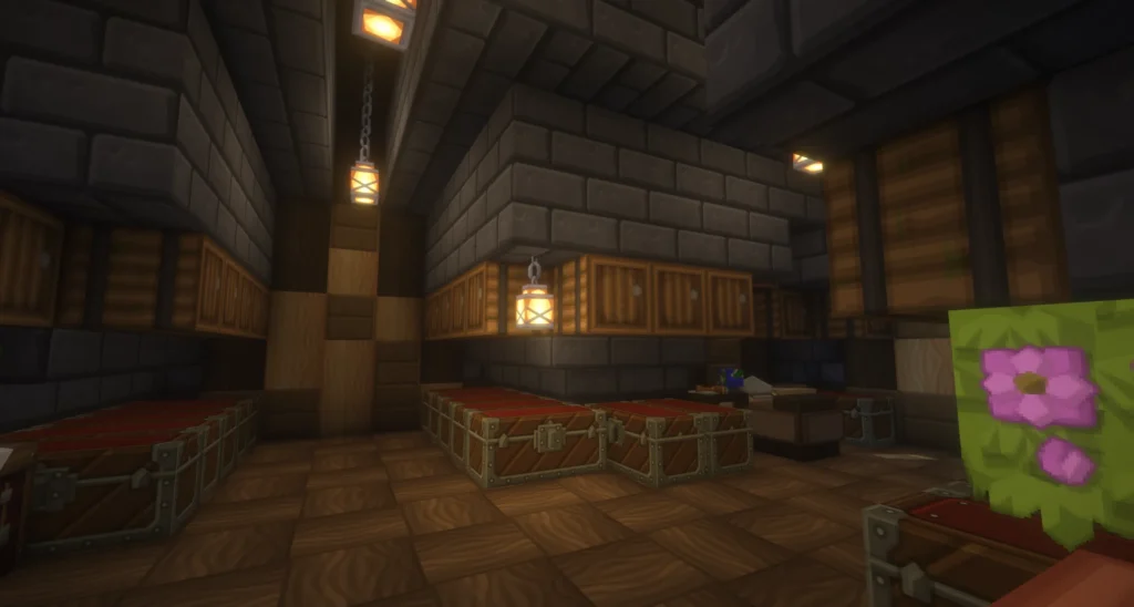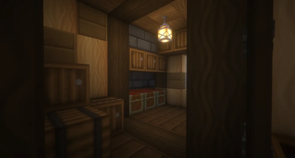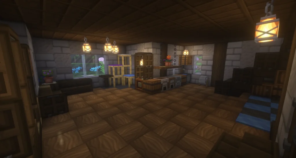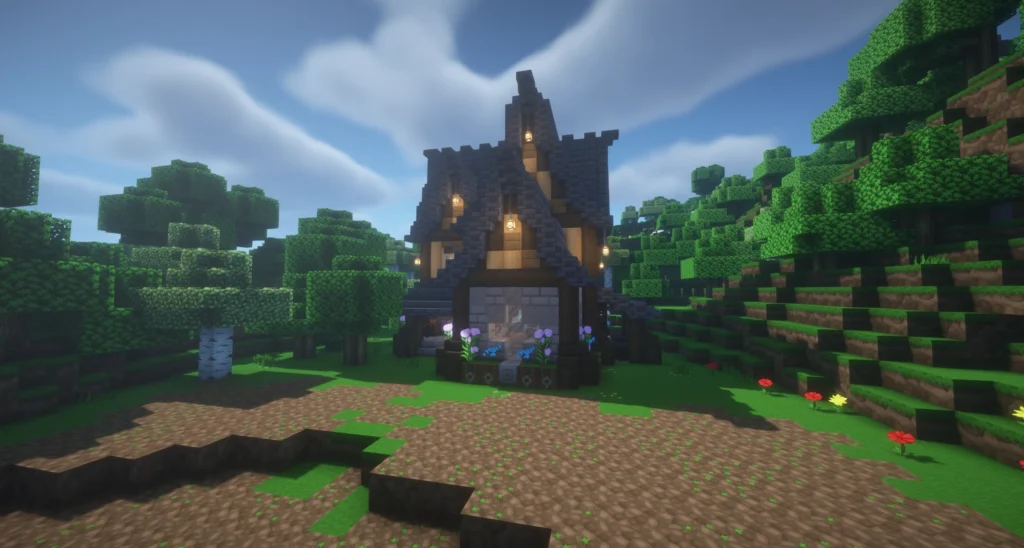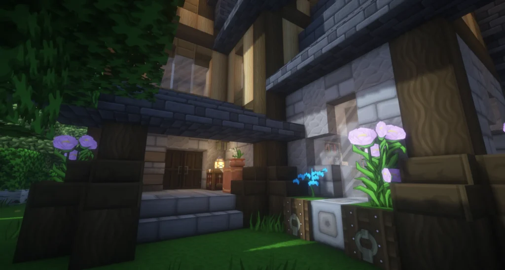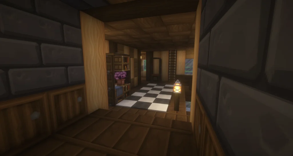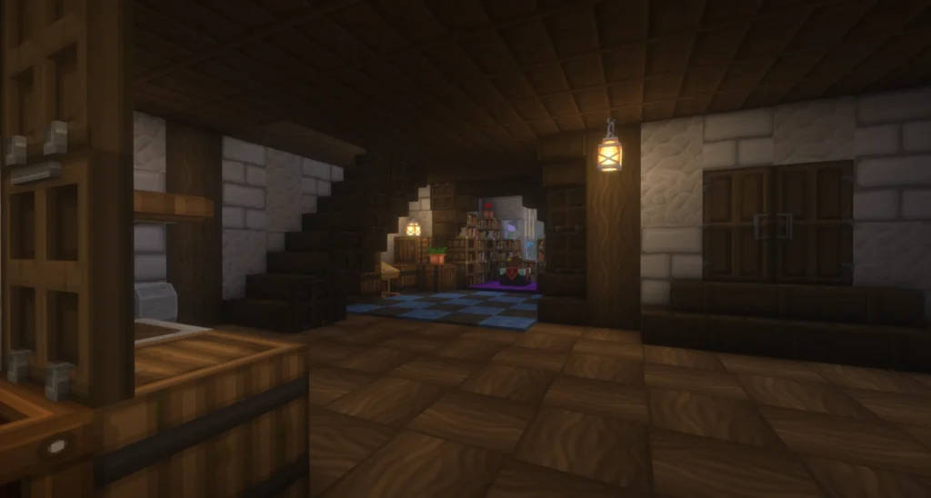 Architektonisch hebt sich das fünfte Wohnhaus deutlich von seinen Nachbarn ab. Dunkler Stein, Zinnen, ein spitzer Turm und warme Holzakzente verleihen dem Gebäude einen fast herrschaftlichen Charakter – ein Haus, das Bestand hat. Der Eingang wird von einem kleinen Blumenbeet flankiert, Laternen beleuchten die Fassade stimmungsvoll. Im Inneren entfaltet sich auf drei Ebenen ein vollständig eingerichtetes Zuhause: Das Erdgeschoss beherbergt eine großzügige Küche mit Sitzbereich, das erste Obergeschoss eine Bibliothek mit Schachbrettboden und Lesesessel, das Schlafzimmer ein gemütliches Bett mit Pflanze am Fenster. Der ausgebaute Dachboden mit Truhenrundet das Bild ab – hier ist an alles gedacht.